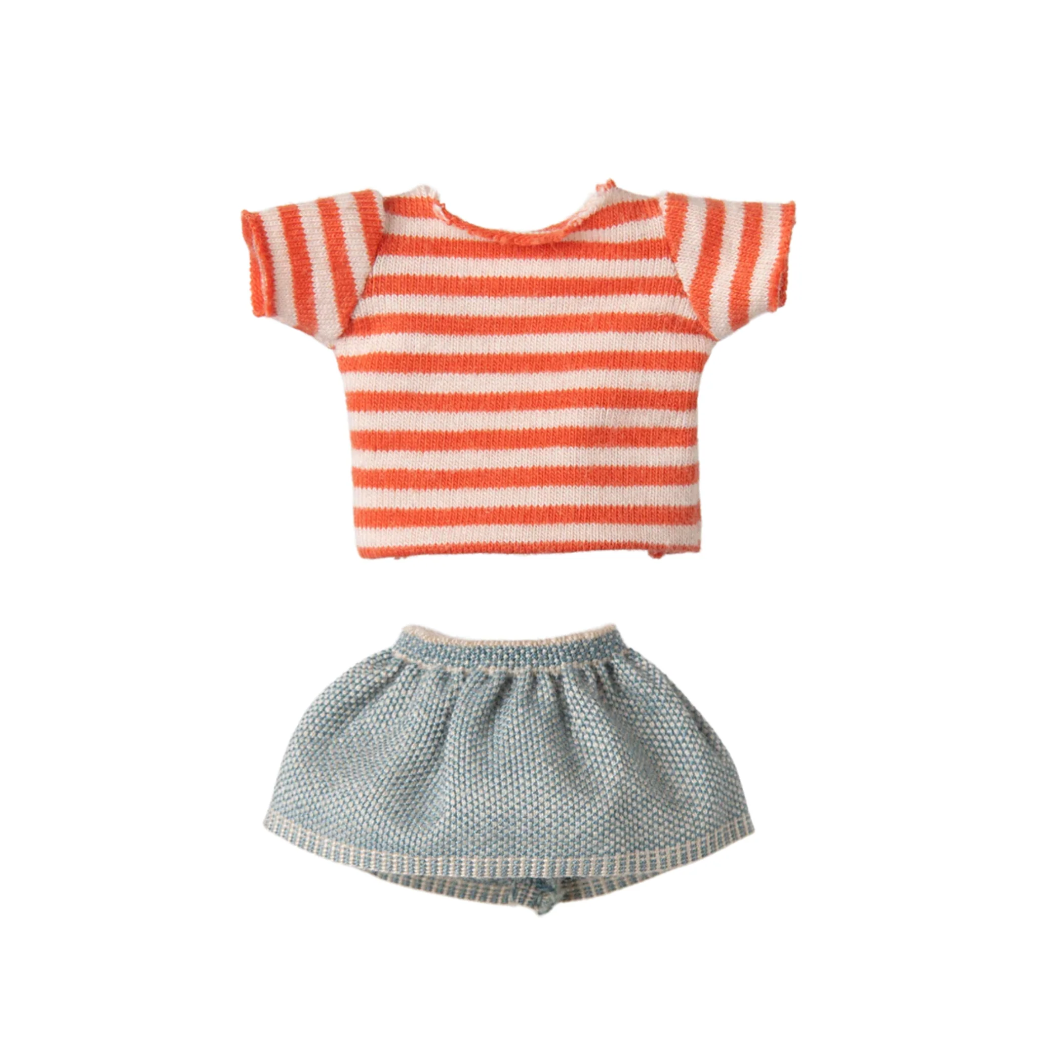 Introducing the Mimie Big Sister Mouse by Maileg. This adorable mouse is the perfect companion for your little one. She comes dressed in a Red striped cotton T-shirt and a light blue denim skirt. Her hands are magnetized for easy accessory holding, perfect for holding onto the Maileg scooter or tricycle when she's out on adventures with her brother Louimax.Â