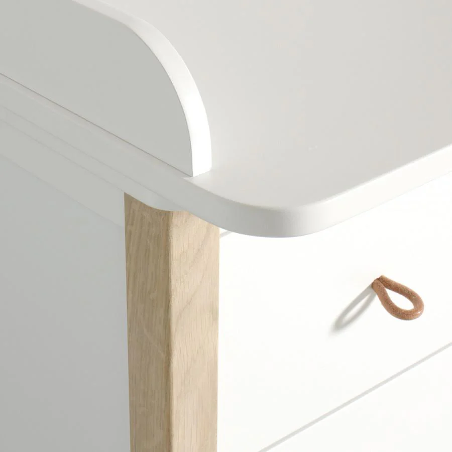 This beautiful white and oak changing table features four spacious drawers which are mounted on high quality rails with ‘soft close’ technology. The changing unit provides a secure space to care for your baby. Its form, function and quality are designed for long time use and when the changing top is not needed any more it can be easily removed, leaving you with an aesthetic chest of drawers.