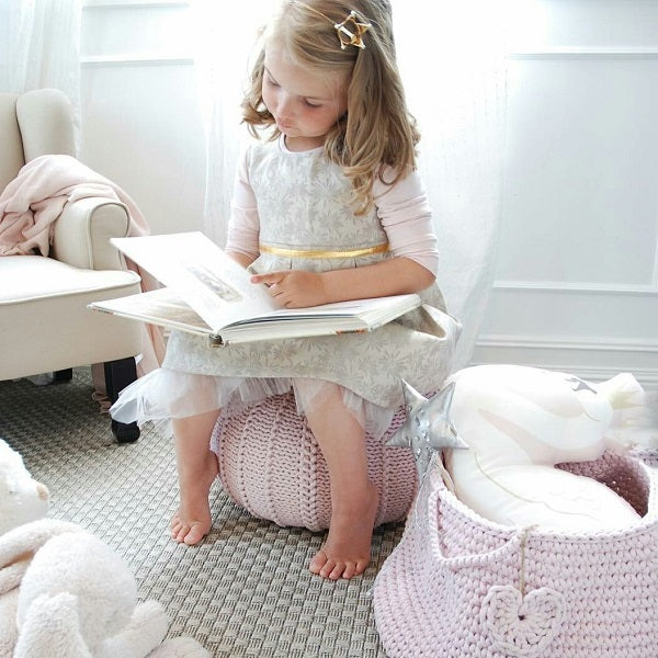 This handmade pouffe in Pale Pink is a beautiful addition to any nursery or young child's room. Children just love to play and explore new objects and textures. They are sure to love this cozy knitted pouffe to sit, play, climb and rest. You will love it too!